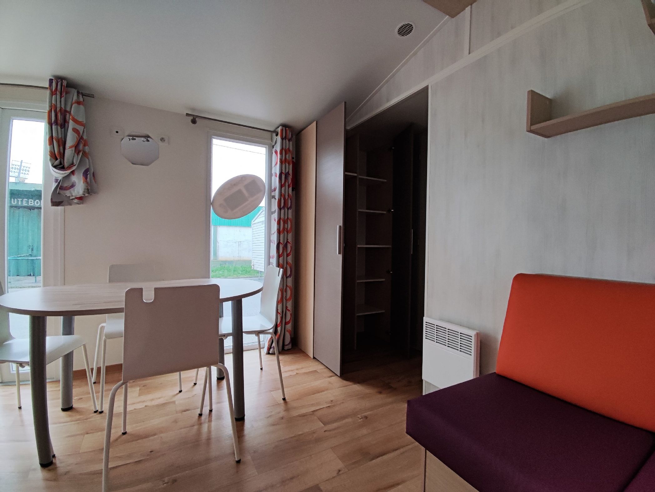 El salón con sofá convertible para dos personas, mesa de comedor con cuatro sillas fáciles de guardar!