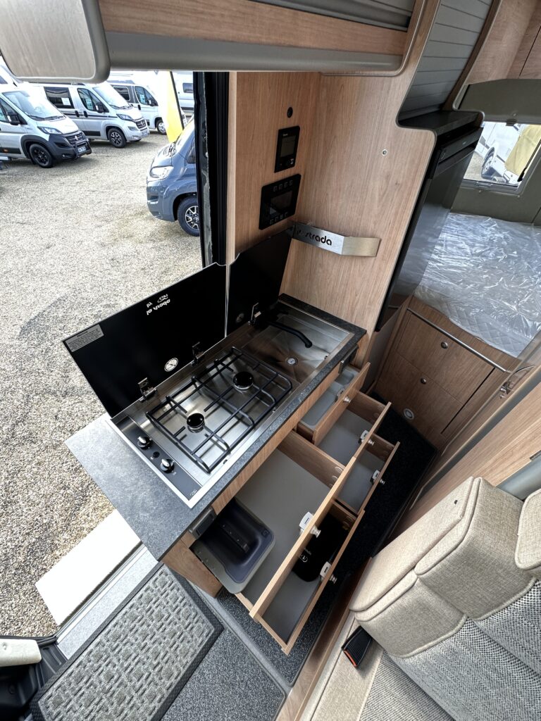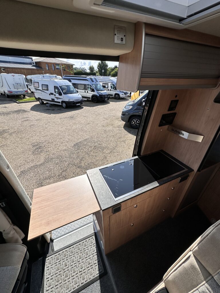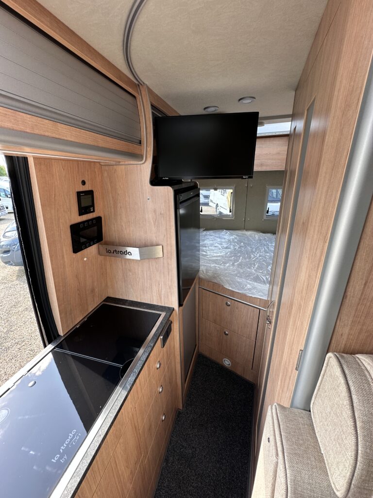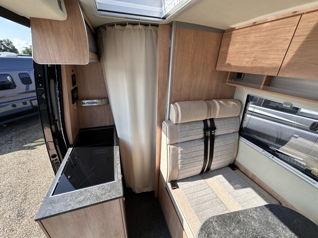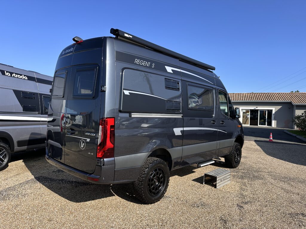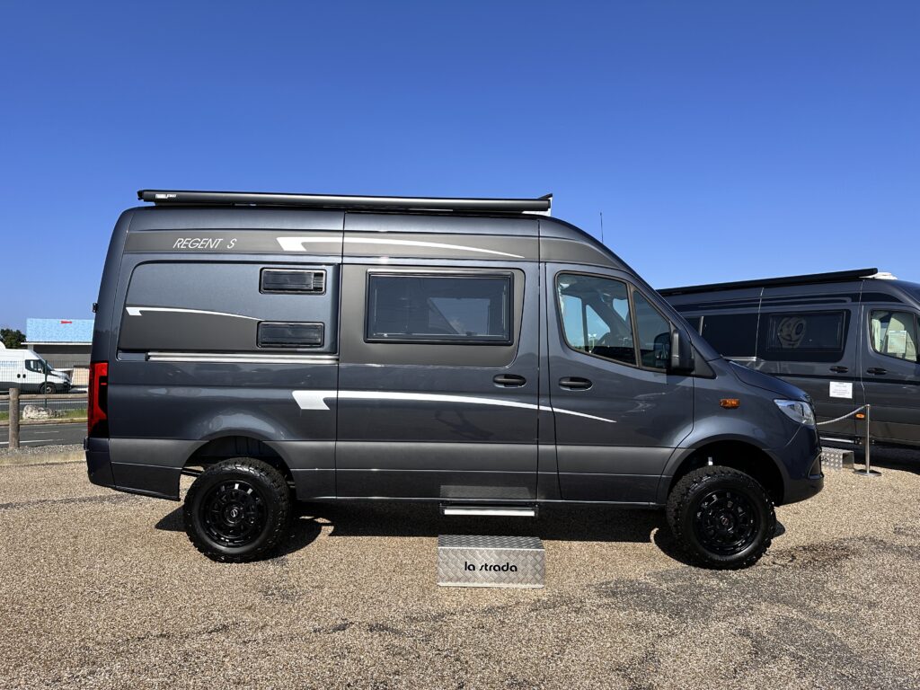 La Strada Regent S 4×4, Colección 2024, peso pesado 4,1 T, cama transversal en espera, cuarto de baño con ducha integrada. Cocina a la derecha con mucho espacio de almacenamiento y una gran encimera extraíble, salón delantero con asiento giratorio.