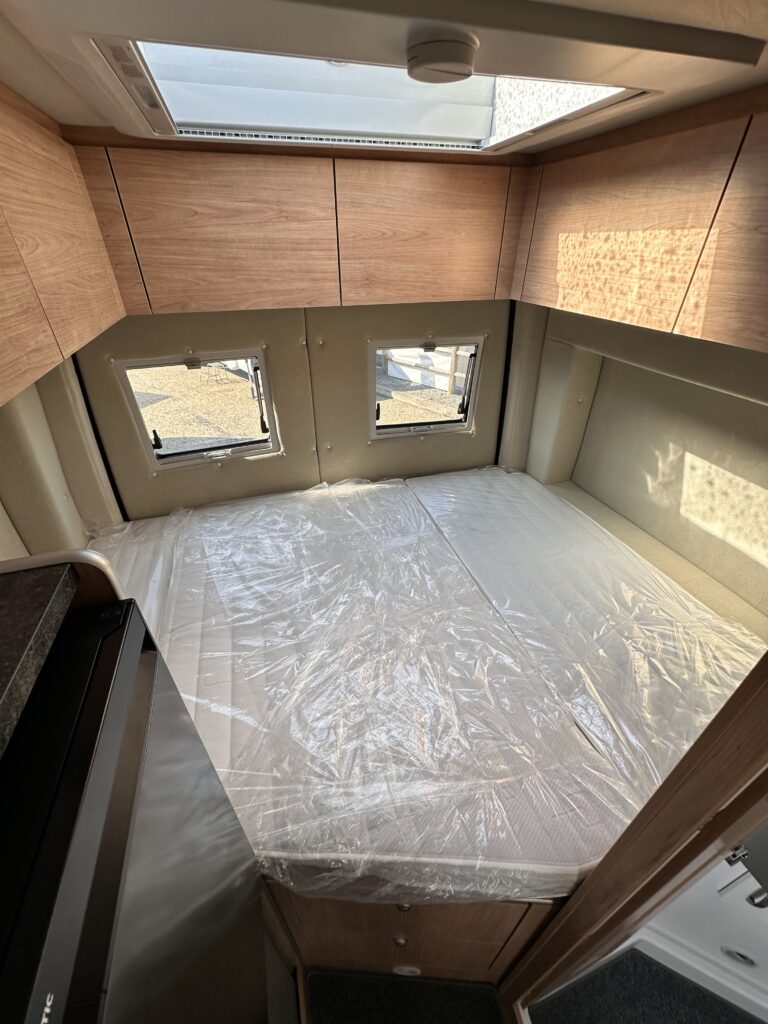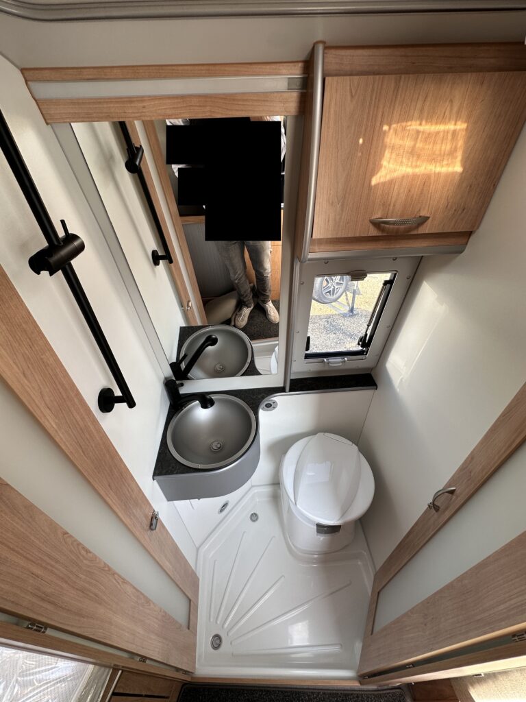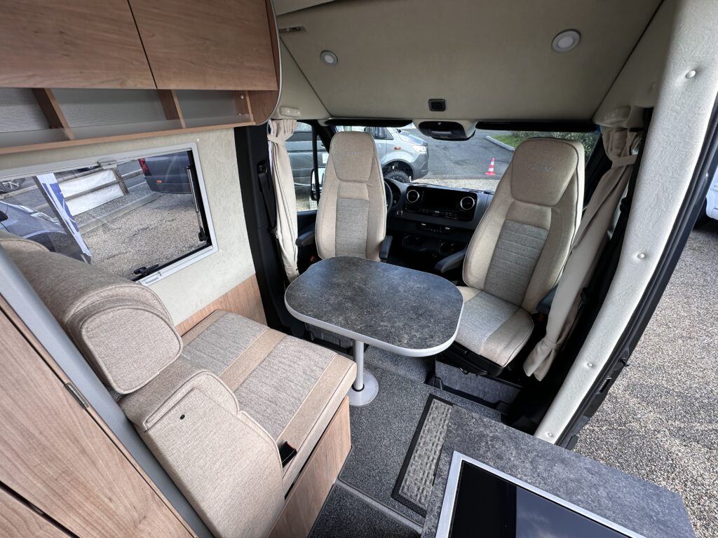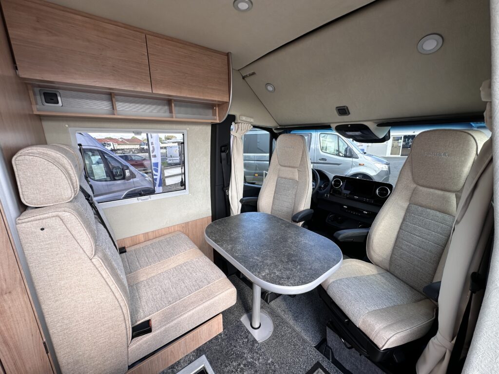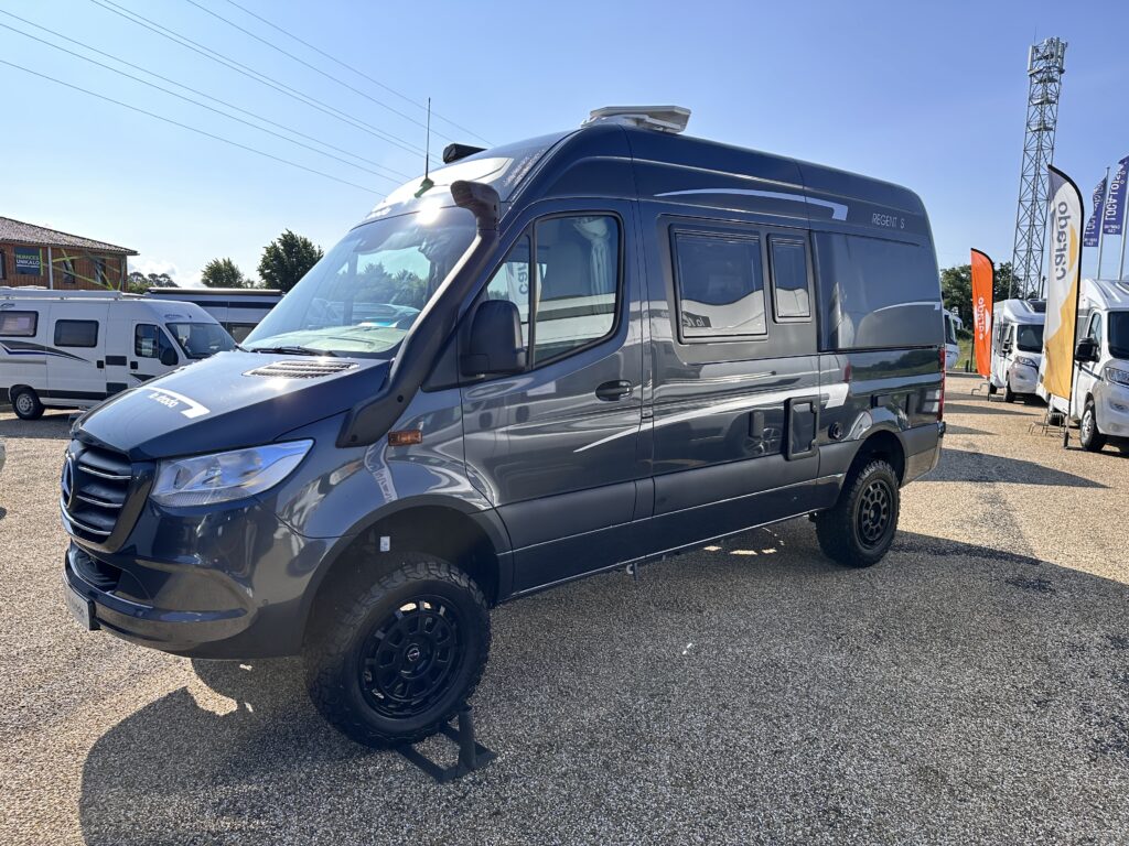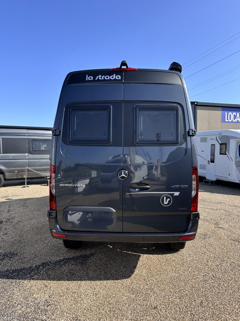 La Strada Regent S 4×4, Colección 2024, peso pesado 4,1 T, cama transversal en espera, cuarto de baño con ducha integrada. Cocina a la derecha con mucho espacio de almacenamiento y una gran encimera extraíble, salón delantero con asiento giratorio.